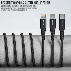 Lapster Rapidzz 3-in-1 Trio Multi Functional Cable | 1.5m Braided Fast Charging & Data Transfer Cable | USB Type-A & Type-C | Tangle-Free Design (Black)