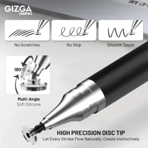 Dual-tip stylus with fine disc and soft rubber tips for precision and smooth navigation.