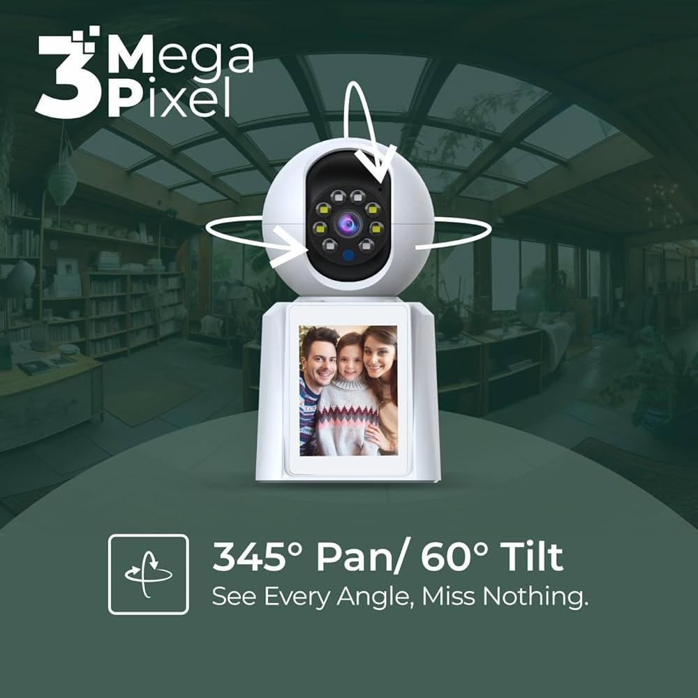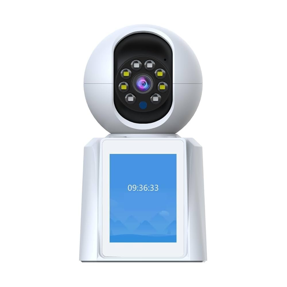 Keep your home safe with the 3MP Wi-Fi Home Security Camera featuring a built-in screen for direct monitoring. Enjoy full 360° pan-tilt coverage, two-way audio for easy communication, and advanced motion detection that sends instant alerts. Supports SD cards up to 256GB for local recording and provides clear night vision for 24/7 security. Perfect for indoor surveillance and smart home integration.