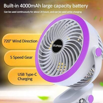 4000mAh Rechargeable Clip Desk Mini Fan, Portable Table Fan,USB Fan, USB Rechargeable Clooing Fan for Men & Women, USB Battery Powered Quiet Personal Fan,5 Speed for Home Office Travel (Purple)