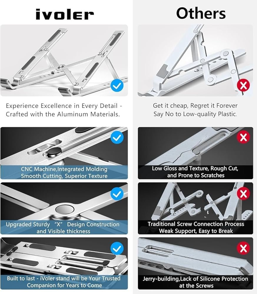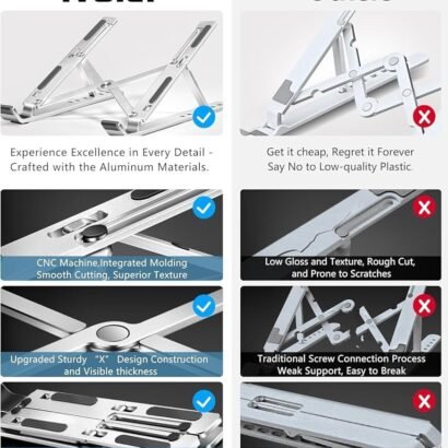 ● Premium Aluminum Construction: Crafted from high-grade aluminum for durability and a sleek, Adjustable Height & Angle: Customizable settings to find the perfect ergonomic position for comfortable typing and viewing. modern look. Non-Slip Base: Equipped with rubberized feet to keep your laptop stand securely in place and protect surfaces from scratches. Portable & Lightweight: Compact and easy to fold, making it ideal for travel, home office, or work on-the-go. Easy Assembly: Simple to set up with no tools required, ready for immediate use right out of the box. Universal Compatibility: Designed to accommodate all laptop sizes up to 17 inches, as well as tablets and e-readers.