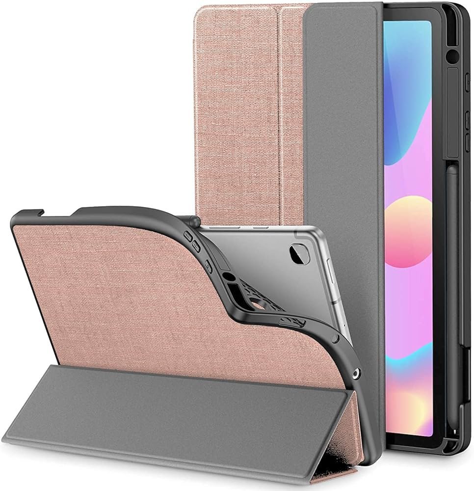 Rose Gold Ultra Slim Magnetic Stand Cover for Samsung Galaxy Tab S6 Lite 10.4″ – Built-in S Pen holder, Auto Sleep/Wake, tactile grip, raised camera cutout, and hands-free viewing.