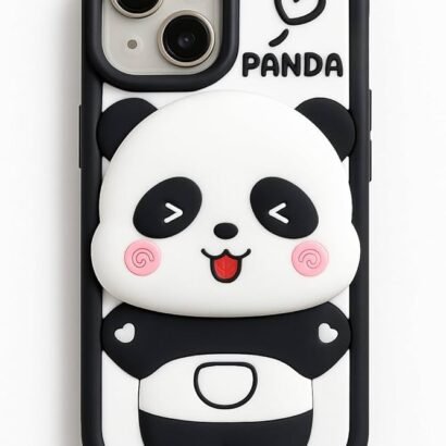 Black 3D Panda Silicone Case for iPhone 15 – Kawaii cartoon design with soft, shockproof silicone for full protection and playful style.