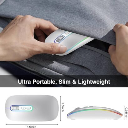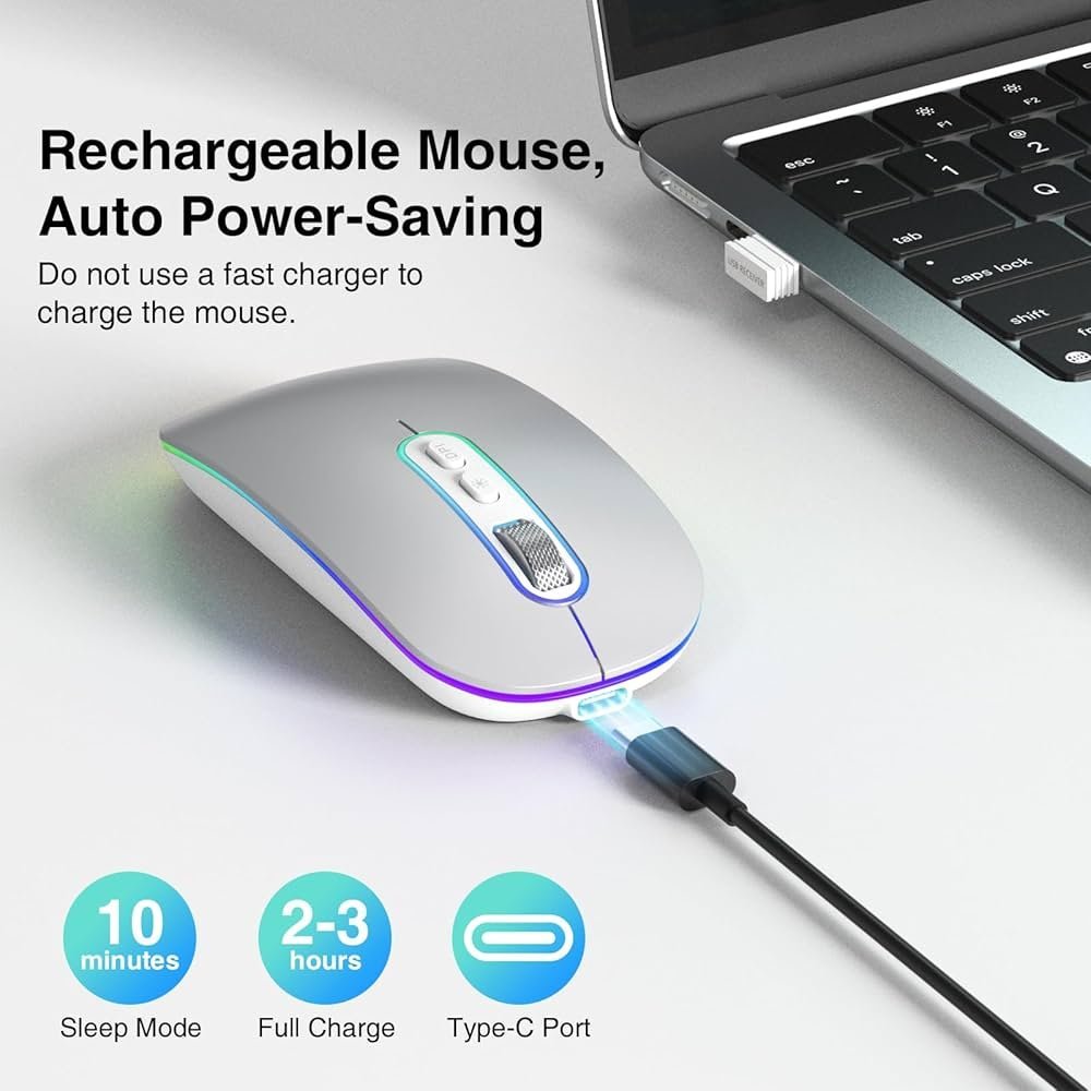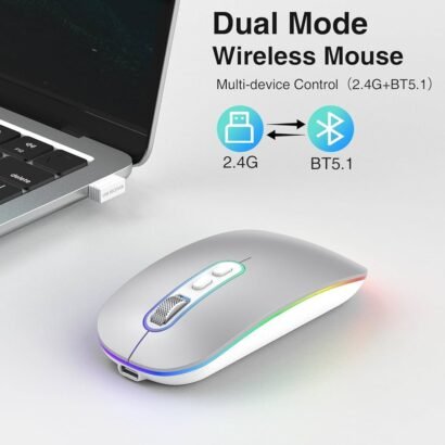 Dual Mode (BT 5.1+2.4G) Wireless Mouse for MacBook, Rechargeable Portable Lightweight Mouse for Laptop with LED Lights, Compatible with Laptop-PC-Mac OS-Windows-Chrome OS – Silver
