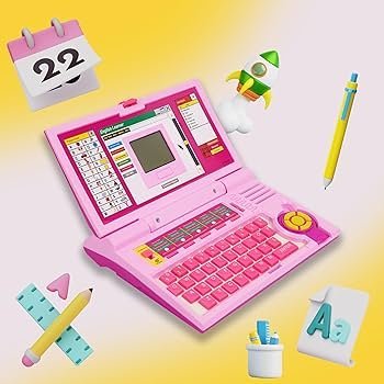 Pink educational laptop for kids to develop logical thinking through interactive stages of learning alphabets, words, and musical notes.