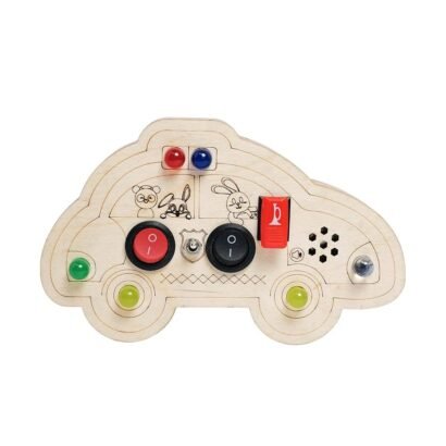 Wooden car-themed busy board with siren sounds, flashing lights, and switches. Supports fine motor skills, sensory learning, and imaginative play.