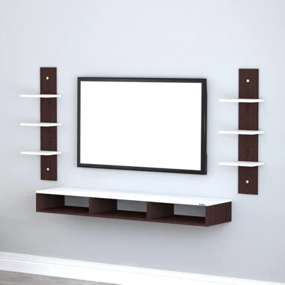Stylish and space-saving wall-mounted TV cabinet made of high-quality engineered wood with a wenge and white finish. Designed for modern living rooms, it features a sturdy structure, smooth finish, and ample storage with multiple open shelves. The wide top surface can hold your set-top box, books, and decor items, making it both functional and elegant.