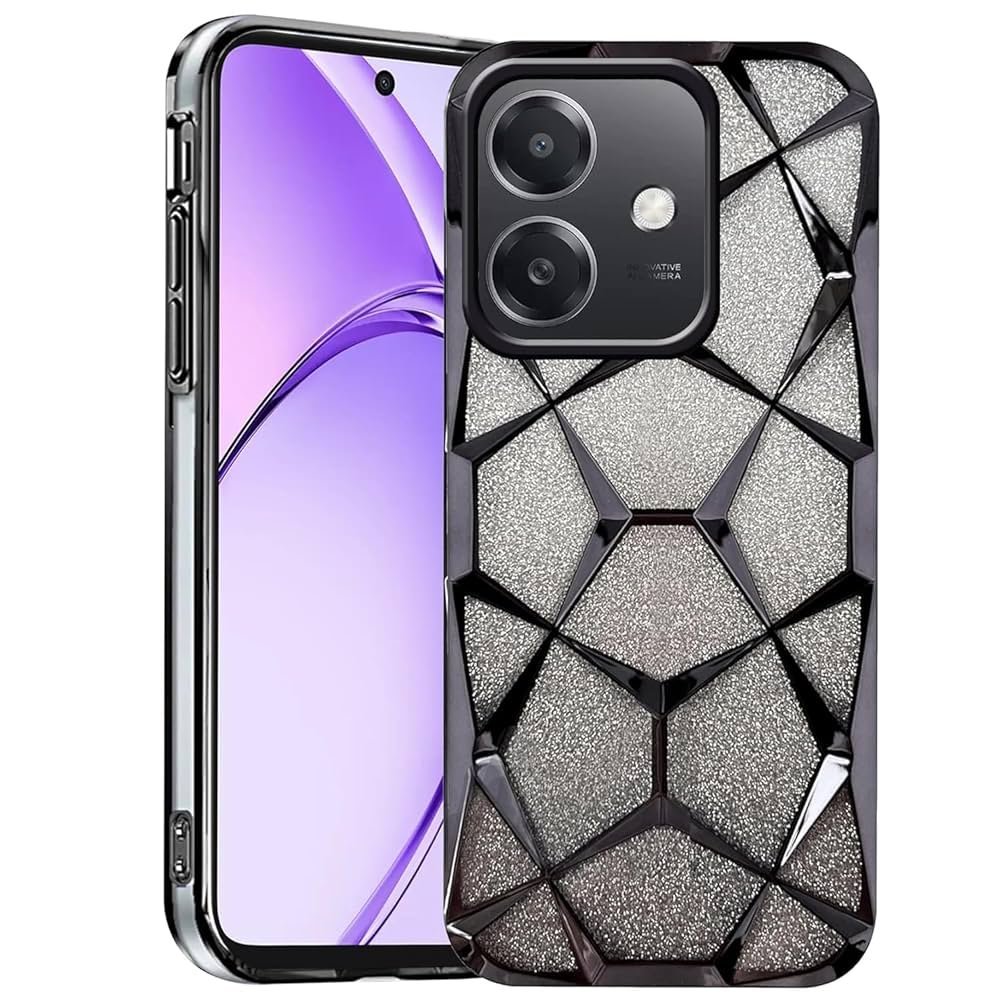 Black Glitter Geometric Case for Oppo A3 / A3x 5G. 3D diamond design, sparkling glitter, full TPU protection, slim and stylish.