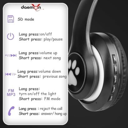 Make listening fun with Kids Cat Ear Bluetooth Headphones, featuring adorable cat ears with LED lights that can be turned on or off as desired. These over-ear wireless headphones provide HD sound with a 105dB volume limit for safe listening. Foldable and adjustable, they are perfect for PC, tablets, school, or travel, combining comfort, style, and functionality. Equipped with a built-in mic and 3.5mm jack compatibility, they allow clear calls and versatile use. A playful and practical gift for kids of all ages.