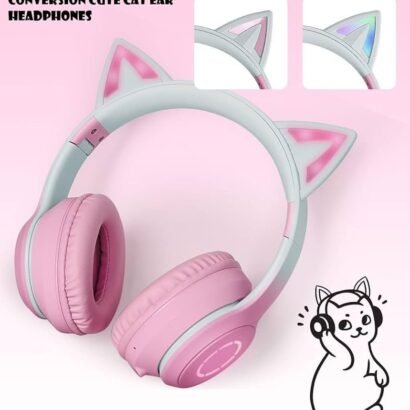 Make listening fun with Kids Cat Ear Bluetooth Headphones, featuring adorable cat ears with LED lights that can be turned on or off as desired. These over-ear wireless headphones provide HD sound with a 105dB volume limit for safe listening. Foldable and adjustable, they are perfect for PC, tablets, school, or travel, combining comfort, style, and functionality. Equipped with a built-in mic and 3.5mm jack compatibility, they allow clear calls and versatile use. A playful and practical gift for kids of all ages.