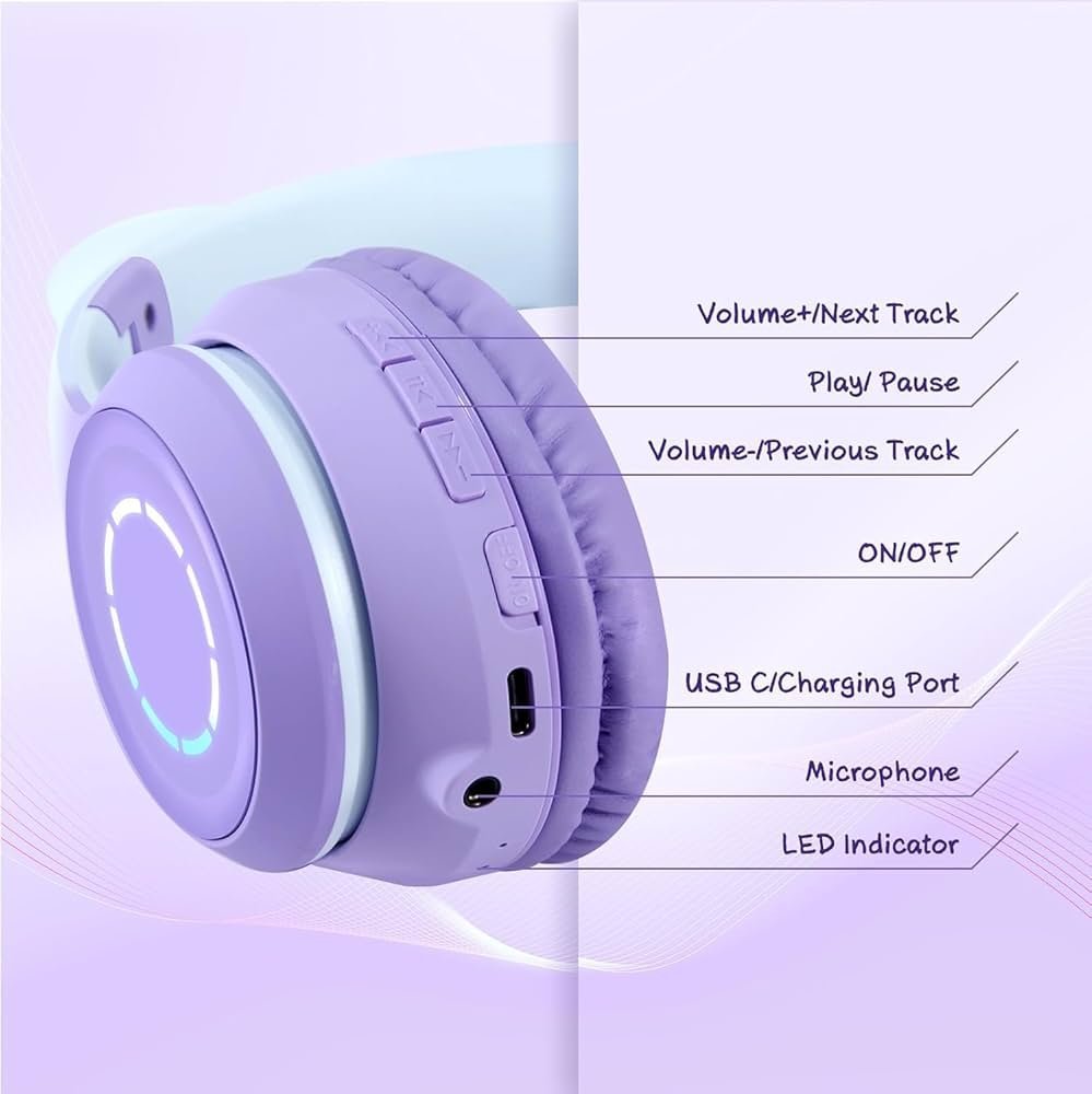 Make listening fun with Kids Cat Ear Bluetooth Headphones, featuring adorable cat ears with LED lights that can be turned on or off as desired. These over-ear wireless headphones provide HD sound with a 105dB volume limit for safe listening. Foldable and adjustable, they are perfect for PC, tablets, school, or travel, combining comfort, style, and functionality. Equipped with a built-in mic and 3.5mm jack compatibility, they allow clear calls and versatile use. A playful and practical gift for kids of all ages.