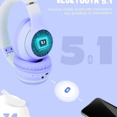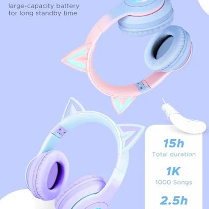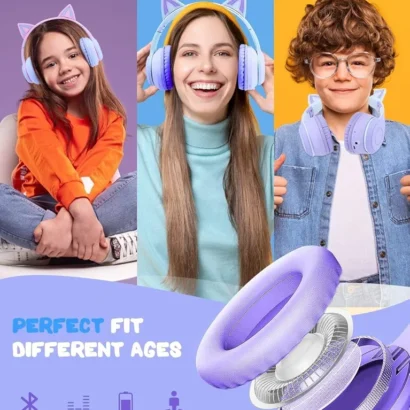 Make listening fun with Kids Cat Ear Bluetooth Headphones, featuring adorable cat ears with LED lights that can be turned on or off as desired. These over-ear wireless headphones provide HD sound with a 105dB volume limit for safe listening. Foldable and adjustable, they are perfect for PC, tablets, school, or travel, combining comfort, style, and functionality. Equipped with a built-in mic and 3.5mm jack compatibility, they allow clear calls and versatile use. A playful and practical gift for kids of all ages.