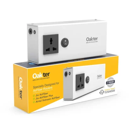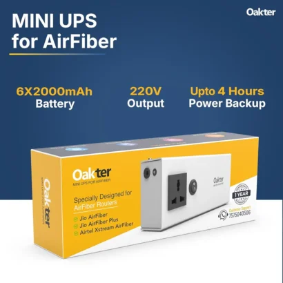This Mini UPS is specially designed for Jio AirFiber, AirFiber Plus, Airtel Xstream AirFiber, and other WiFi routers, ensuring seamless connectivity during power outages. Powered by 6×2000 mAh batteries, it delivers up to 4 hours of backup. Features smart surge and deep discharge protection for your devices. Includes a 12-month warranty for the UPS and 6 months for accessories.
