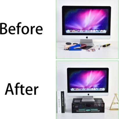 ● 【Monitor Stand with 2 Drawers】Super easy to use – No assembly! Simply pull drawer out of the box for storing almost all of your small office supplies like pens, notebooks, smart phones, notes ,paper, documents, scissors, TV remote etc. Minimizes the messy clutter and saves your valuable desktop space .
