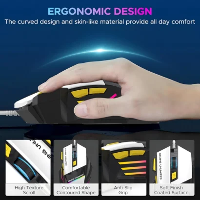 7-button wired optical gaming mouse with 3600 DPI, ergonomic design, and RGB lighting for precise gaming on PC and laptop.