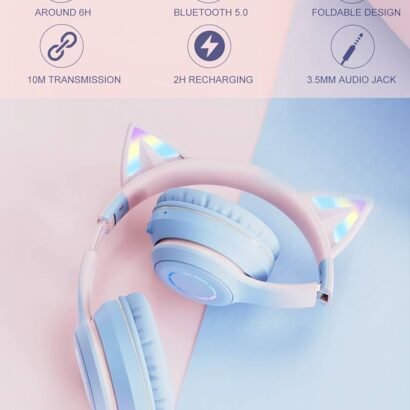 The foldable, lightweight, and over-ear cushioned design ensures maximum comfort and easy portability — ideal for travel, school, and home use. The vibrant pink and blue design with glowing LED cat ears adds a playful touch, making them a perfect gift for kids who enjoy both music and creativity.