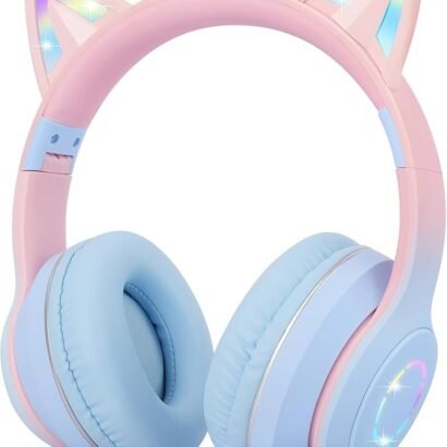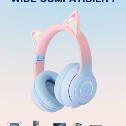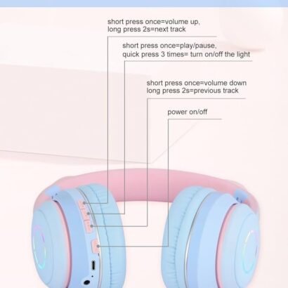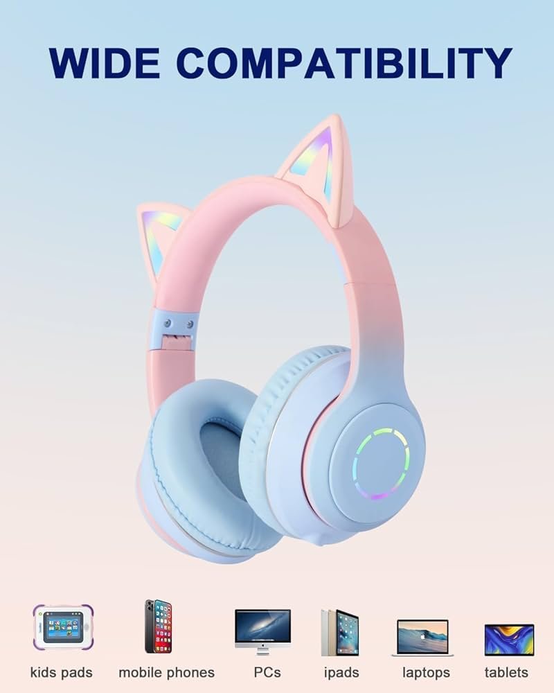 The foldable, lightweight, and over-ear cushioned design ensures maximum comfort and easy portability — ideal for travel, school, and home use. The vibrant pink and blue design with glowing LED cat ears adds a playful touch, making them a perfect gift for kids who enjoy both music and creativity.