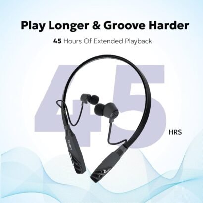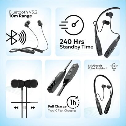 Wireless neckband earphone with Bluetooth v5.2, 45H playtime, Type-C fast charging, ENC, and IPX5 water & sweat resistance.