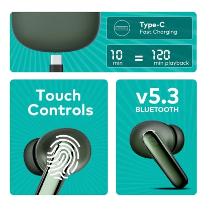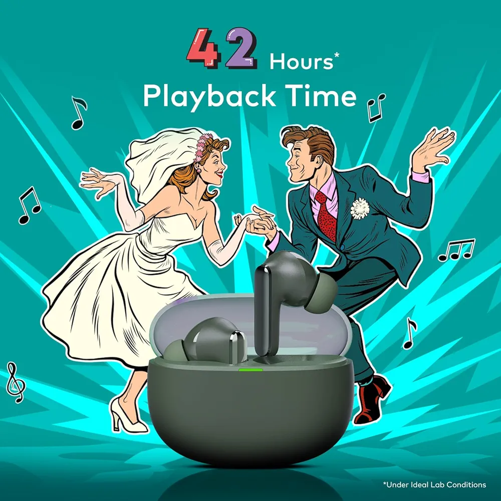 Immerse yourself in pure sound with ROAR 360° Deep Bass True Wireless Earbuds. Enjoy 42 hrs playtime, Quad Mic ENC, and Bluetooth v5.3 connectivity in a stylish Ashy Green design with IPX5 water resistance and powerful 13mm drivers for rich, dynamic audio.