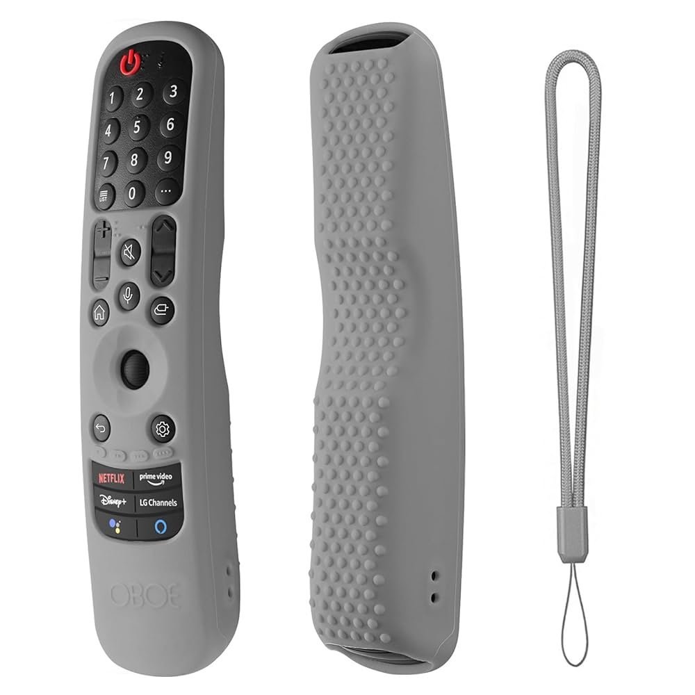 B-Grey silicone cover for LG Magic Remote AN-MR21GA/MR22GA/MR23GA with shockproof protection, anti-slip grip, and lanyard for easy handling.