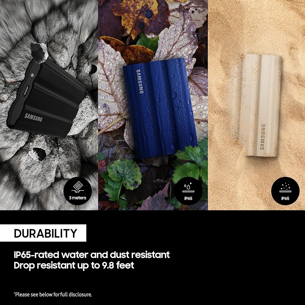Designed for rugged performance, the T7 Shield offers IP65-rated water and dust resistance and can withstand drops from up to 3 meters, ensuring your data stays safe no matter where your work or adventures take you. Compact, lightweight, and portable, it’s the ultimate high-speed storage solution for demanding users.