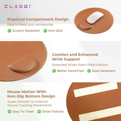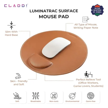 This Tan Circle vegan leather mouse pad offers a smooth, anti-scratch, and water-resistant surface ideal for office desks. Made from premium faux leather, it ensures precise mouse tracking and features a non-slip base for stability. Compact and stylish at 20.5 x 20.5 cm, it’s perfect for laptops, desktops, or portable use.