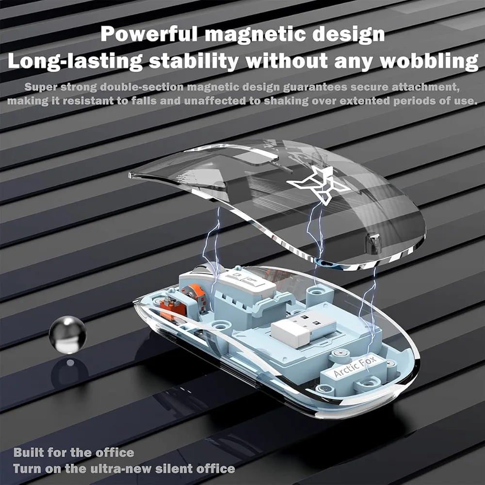 The AF Transparent Wireless Mouse combines style and functionality in a sleek, slim design. Featuring a triple-mode connection—Bluetooth 5.1, Bluetooth 5.1, and 2.4GHz USB receiver—you can seamlessly switch between up to three devices without re-pairing. The optical sensor ensures precise tracking, while the rechargeable battery and LED battery indicator keep you powered throughout the day. Compatible with PC, Mac, laptops, Apple devices, and iPads, this mouse is ideal for work or home use.