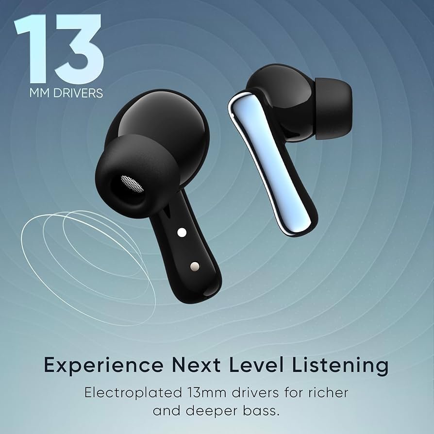 True wireless earbuds with 45H+ playtime, 13mm bass drivers, fast charging, and Bluetooth v5.3 — crafted for powerful sound and long-lasting comfort.