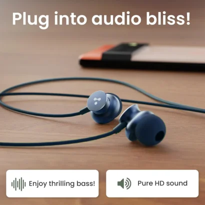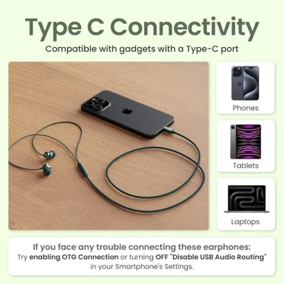 Type-C wired earphones with mic, 10mm drivers, boosted bass, and 1.2m tangle-free cable for clear calls and premium sound.