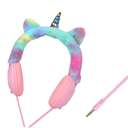 Colorful unicorn-themed wired headphones for kids with a soft fur design, 3.5mm audio jack, and comfortable on-ear fit. Ideal for music, learning, and entertainment.