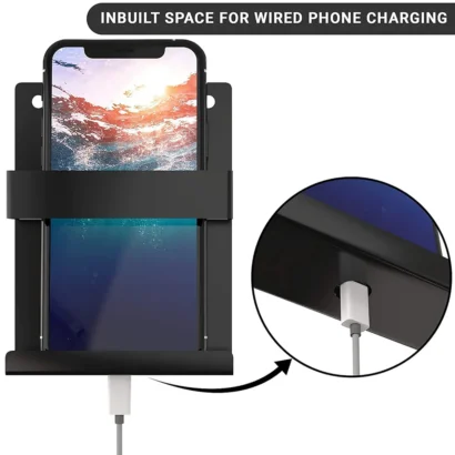 Sturdy metal wall mount holder for smartphones and remotes. Easy to install, powder-coated finish, perfect for organized charging and storage.