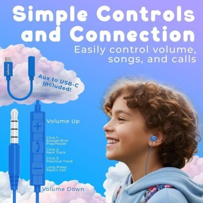 The earphones include a universal 3.5mm audio jack and a USB-C adapter, ensuring compatibility with a wide range of devices — from smartphones and tablets to laptops and gaming consoles. With volume control built right in, kids can easily adjust sound levels for safe listening.