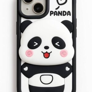 Cute 3D Panda Design Silicone Protective Back Cover Case for iPhone 15 – Shockproof Cartoon Case for Girls, Kids & Men, Black